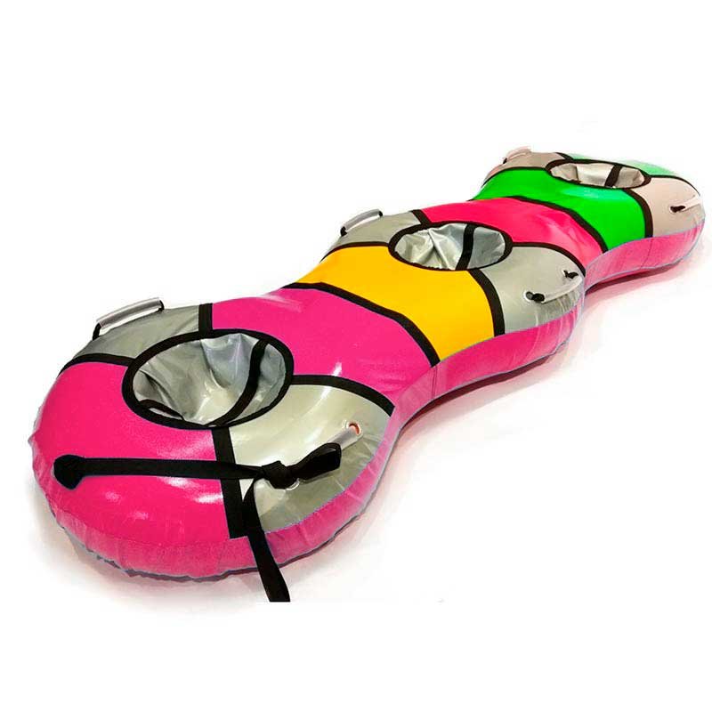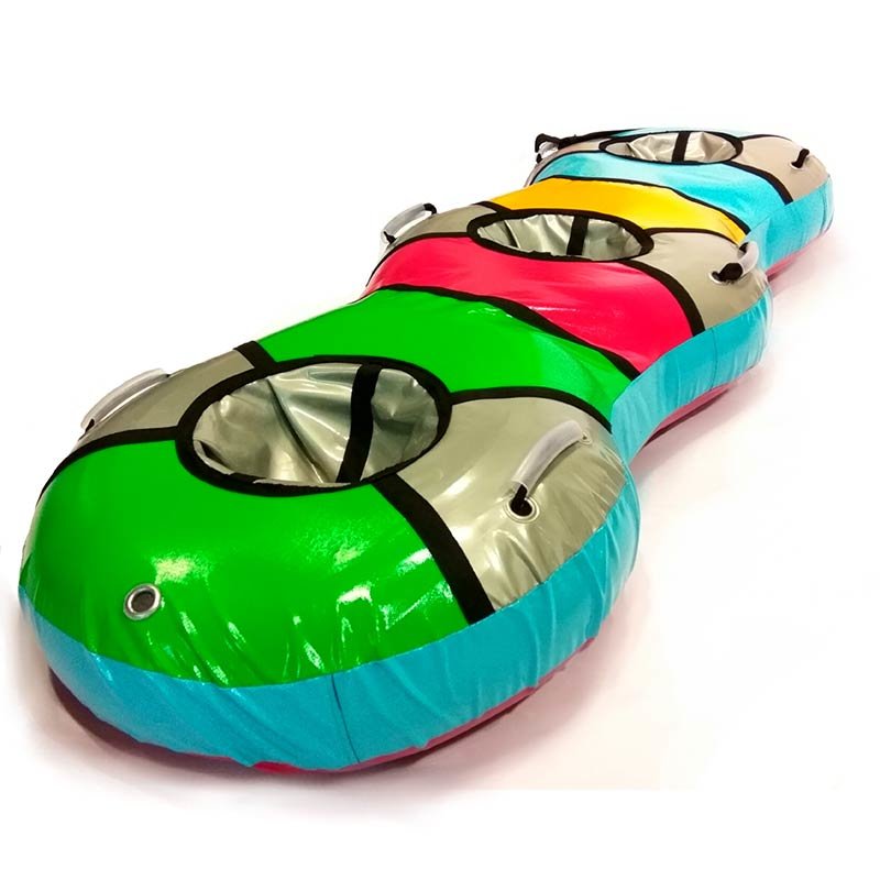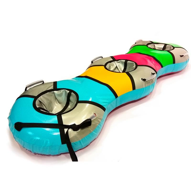 Тюбинг Snow Show тройной «Трио-Банан», предназначенный для катания втроем, изготовлен из высококачественной тентовой ПВХ ткани, которая произведена исключительно в странах-участницах Европейского Союза. Как и в тюбингах «Элит», используется особо прочная ткань для днища с глянцевой поверхностью повышенной скользкости. «Банан» имеет три посадочных места и шесть ручек. Конструкция данного тюбинга устроена так, что под одним чехлом располагаются три камеры. Накачивать надо каждую камеру отдельно. Тюбинг отличн